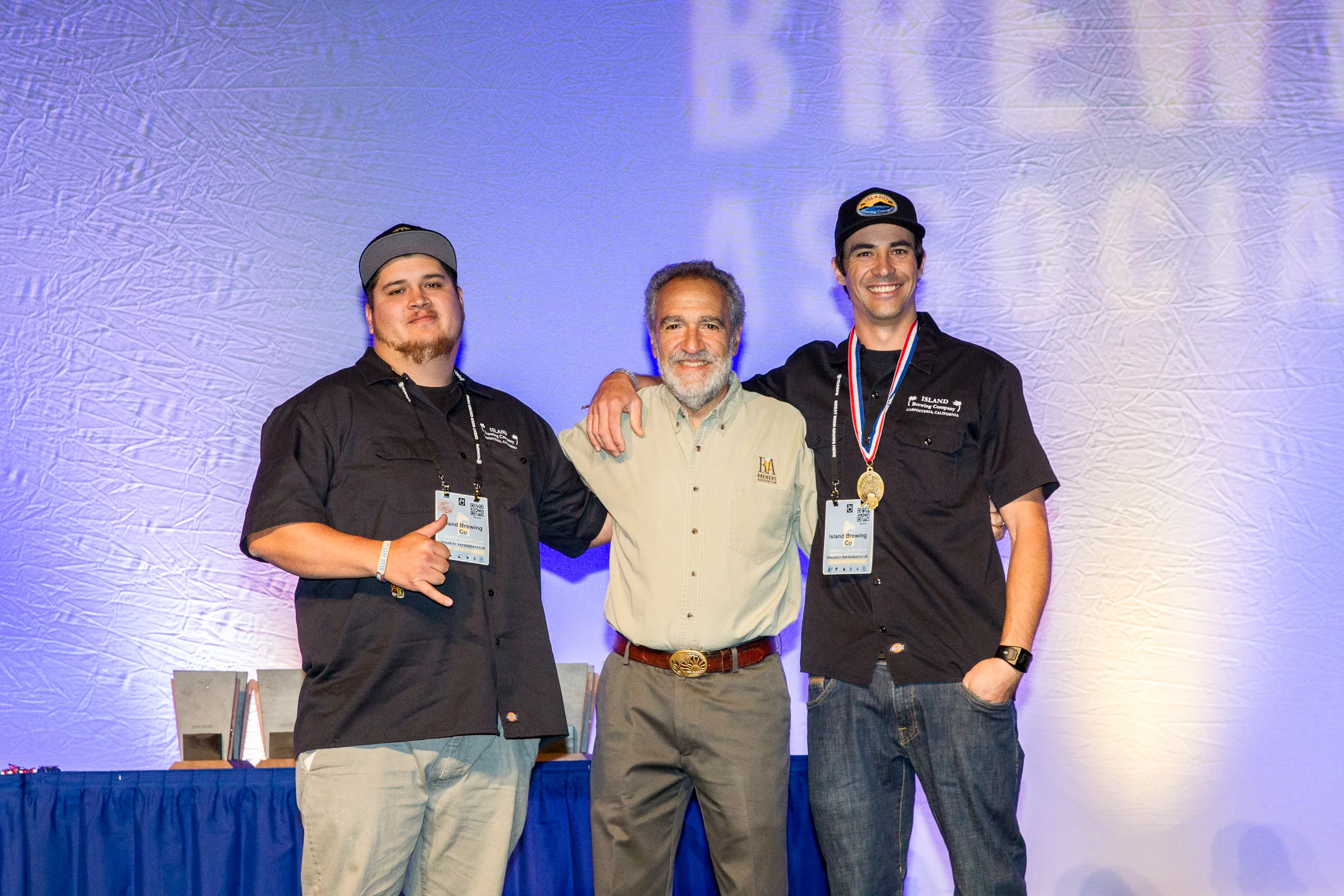 Sales Manager Javier Morales, founder of the Association of Brewers Charlie Papazian, and Head Brewer Ryan Morrill in GABF glory.